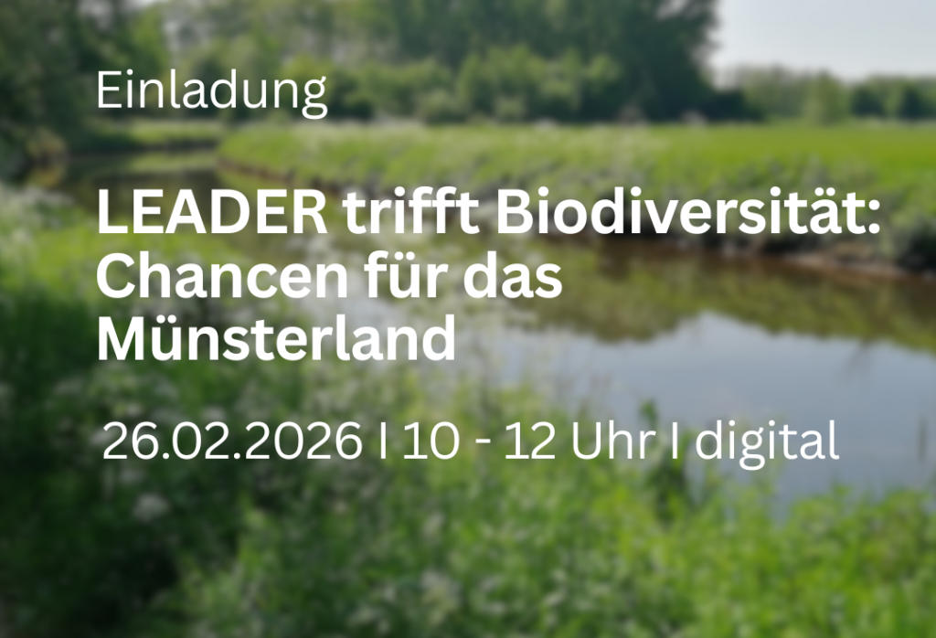 Am Donnerstag, 26. Februar 2026, von 10:00 bis 12:00 Uhr laden die LEADER-Regionen des Münsterlandes alle Interessierten herzlich zur digitalen Netzwerkveranstaltung „LEADER trifft Biodiversität: Chancen für das Münsterland“ ein.