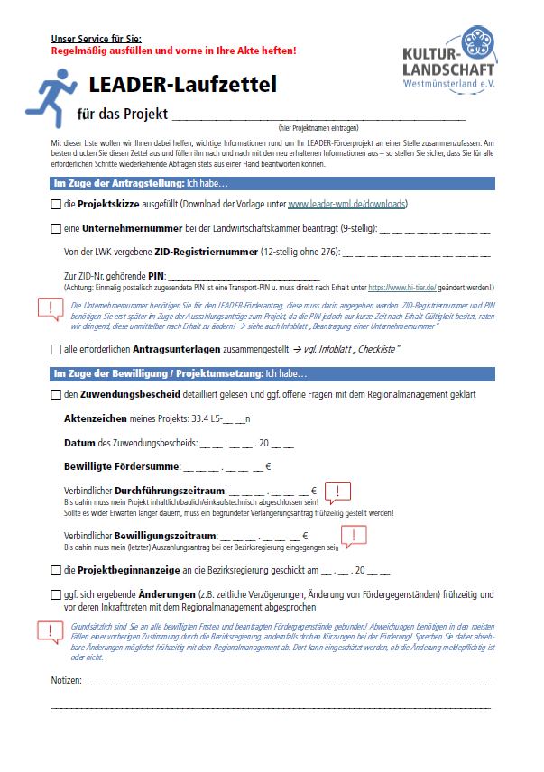 NEU: „Laufzettel“: Halten Sie alle wichtigen Arbeitsschritte und Informationen rund um Ihren Projektantrag fest – für Projektträger hilfreich