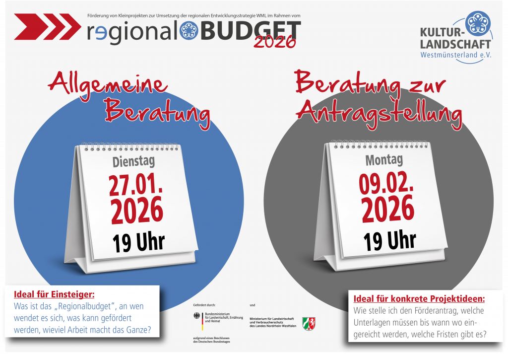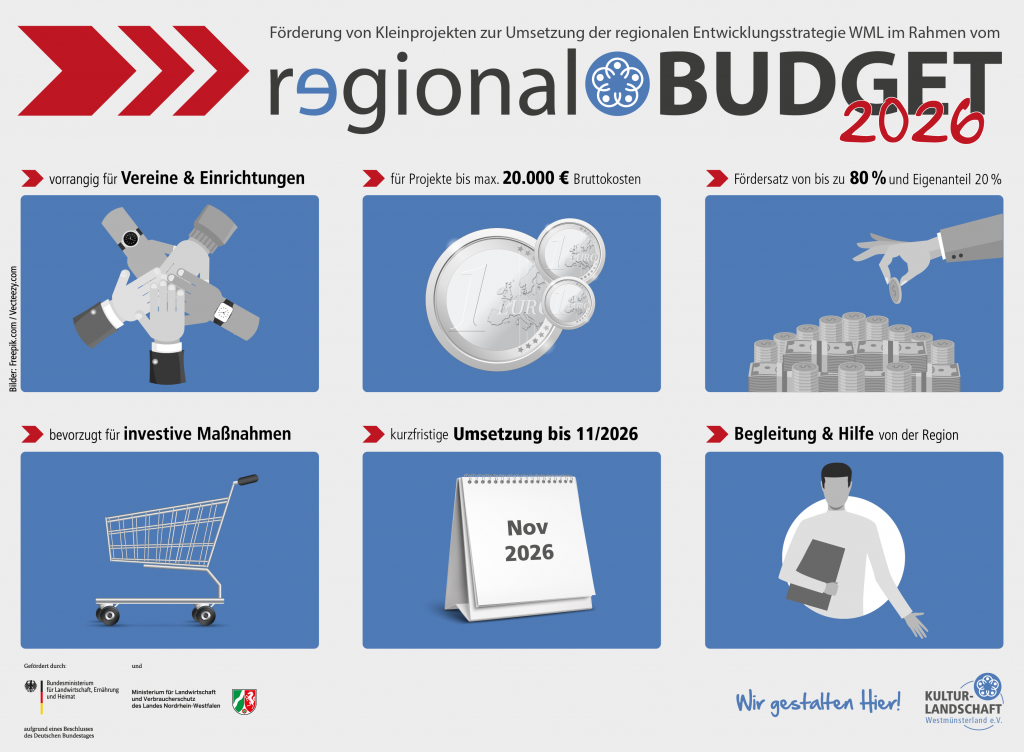- Ob das Regionalbudget 2026 tatsächlich angeboten werden kann und falls ja in welcher Höhe, hängt von der Entscheidung des zuständigen Landesministeriums ab – diese steht noch aus!